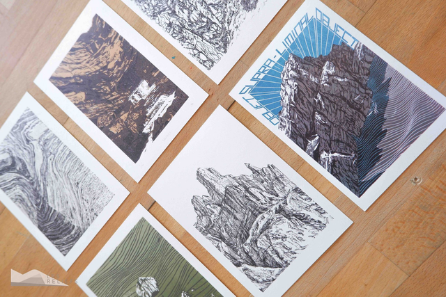 Buy this Landscape postcard set for yourself, or to give away. This set of 6 high quality reproductions of my prints and drawings is printed recycled paper. This set contains te postcards 'Elevation', 'Abstraction II', 'Cornes du Chamois', 'Jallouvre', 'Source de la Saine' & 'Source'. Your order is always accompanied by a little original 'Les Reliefs' woodcut.