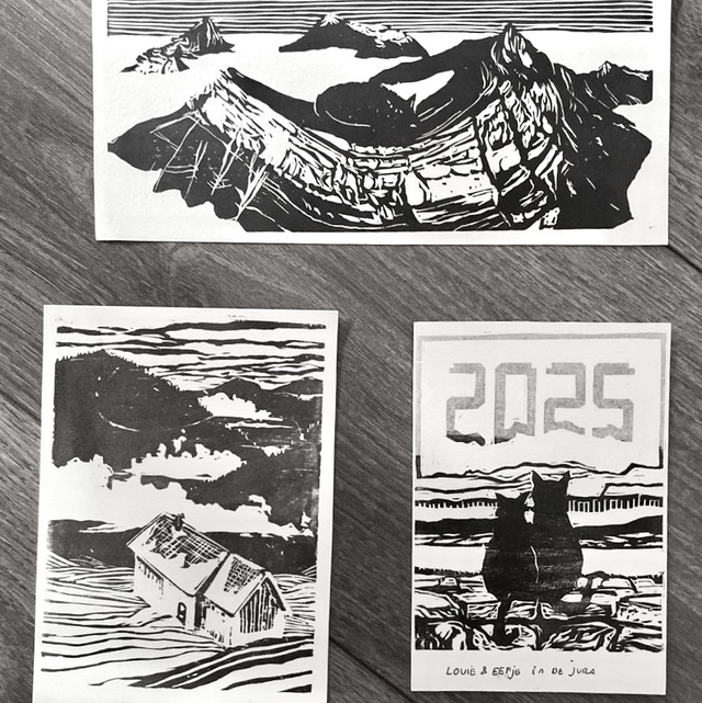 Op de tweede afbeelding zie je nieuwjaarsprenten van de jaren 2023, 2024 & 2025.